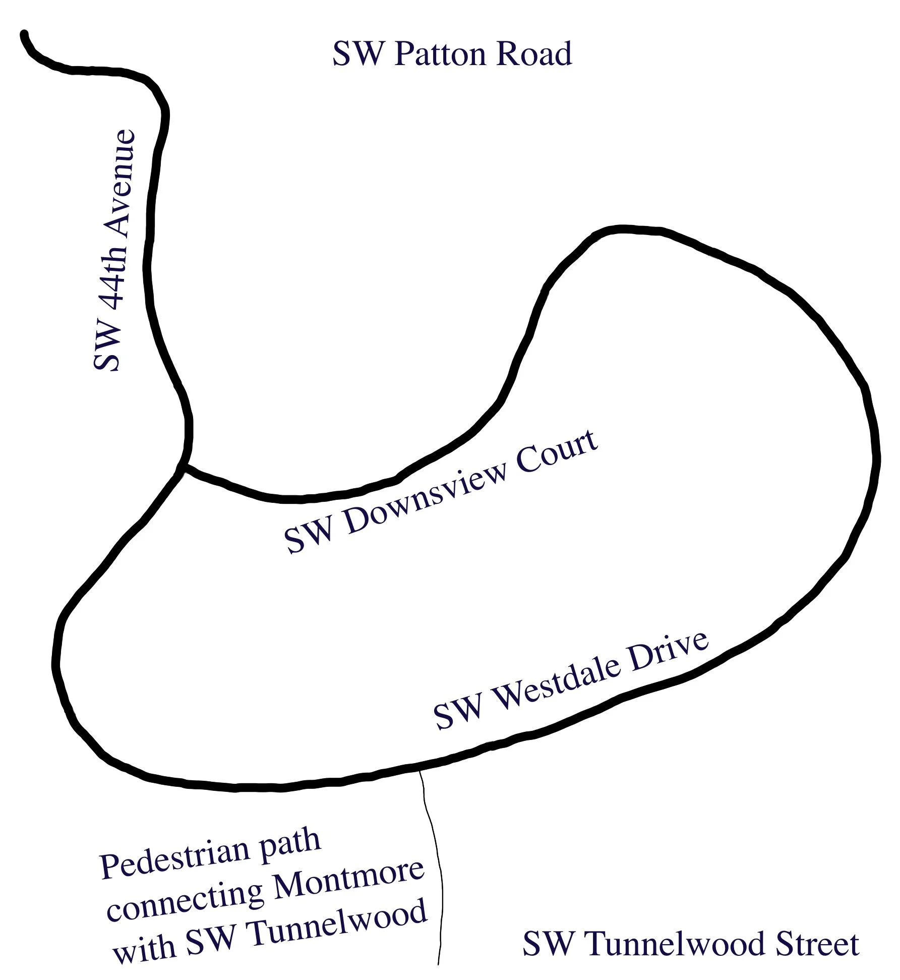 7. The SW Tunnelwood to SW Tunnelwood walkway in NE Bridlemile lets walkers stay on track despite a short break in the SW Tunnelwood roadway. Motorized vehicles wanting to continue on SW Tunnelwood have to take a several block long detour.